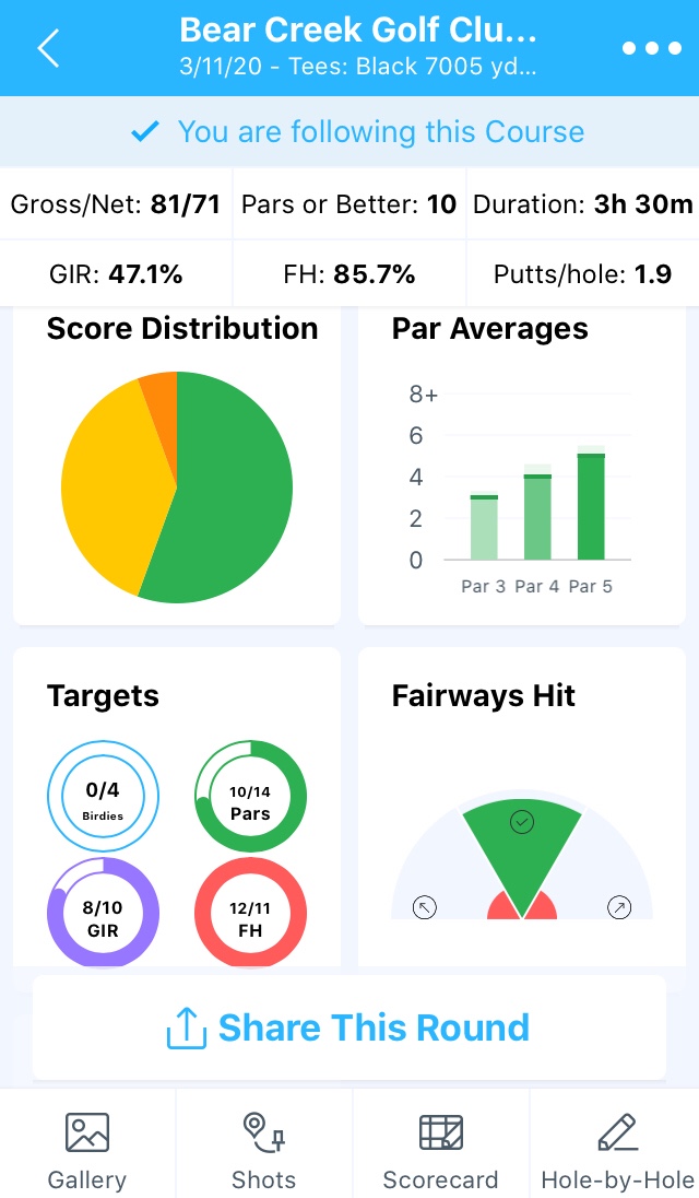 My putting wasn’t bad today. I made some genuinely difficult two-putts and par savers. It didn’t feel all that great though because I continue to burn up hole edges. I think it is a green reading problem. Generally, I’m not missing these moderately distanced putts because of my start line and the pace is generally good. If I was perfect with my pace, maybe some of the lip outs and those just below or above the cup would fall. However, I think I am struggling with the variable green speed as I move on from Winter golf. In the winter on a lot of these courses, you just have to hit it at the hole and make sure you get it there, and the break won’t knock you offline unless it is crazy. The greens are getting back to their peak faster than you would think for how wet a winter we had. Despite the fairways being waterlogged on most of the course, the greens were pretty quick and the ball marks were actually hard to find they dug in so little. I think this will just be a feel thing. I don’t think this is usually a weakness of mine.