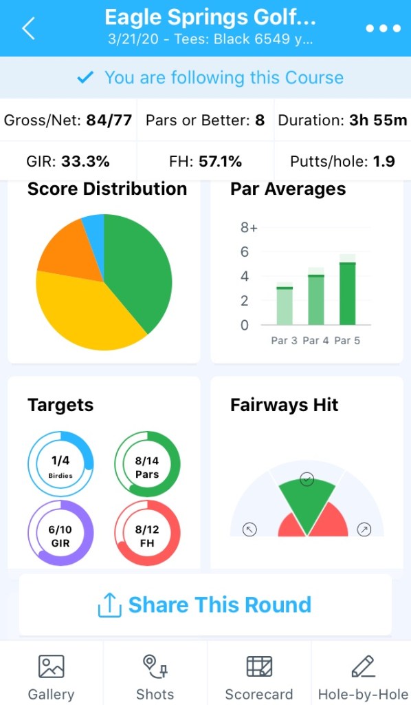 My putting continues to be a travesty. I missed 6 or 7 putts inside of six feet including leaving multiple putts in the heart of the cup but short and a lip out. I also had two three-putts on the back. If I hadn’t chipped in twice and barely missed a couple more for easy tap-ins, things would have been even worse. One of my chip-ins was to save bogey to stop the bleeding on 12. The other, two holes later, was for a birdie after leaving a pitching wedge woefully short on the par 3 14th.