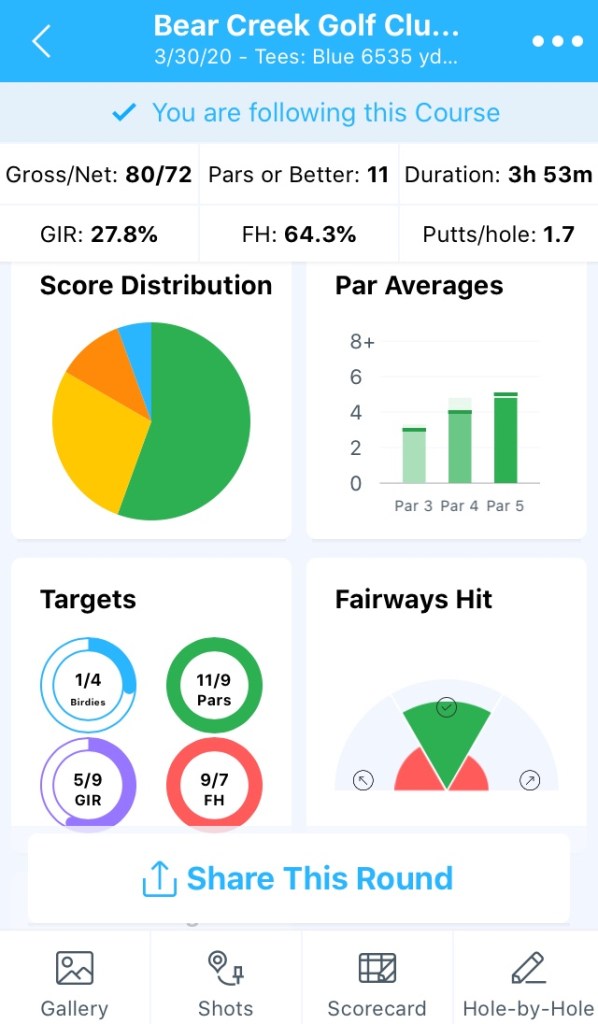 I shot lower than my last round from the Tips at Bear Creek and made more birdies (1-0) even playing slightly worse I believe. However, I played to the course handicap, so I don’t really see how you can call it a win when I didn’t go low even in Net.