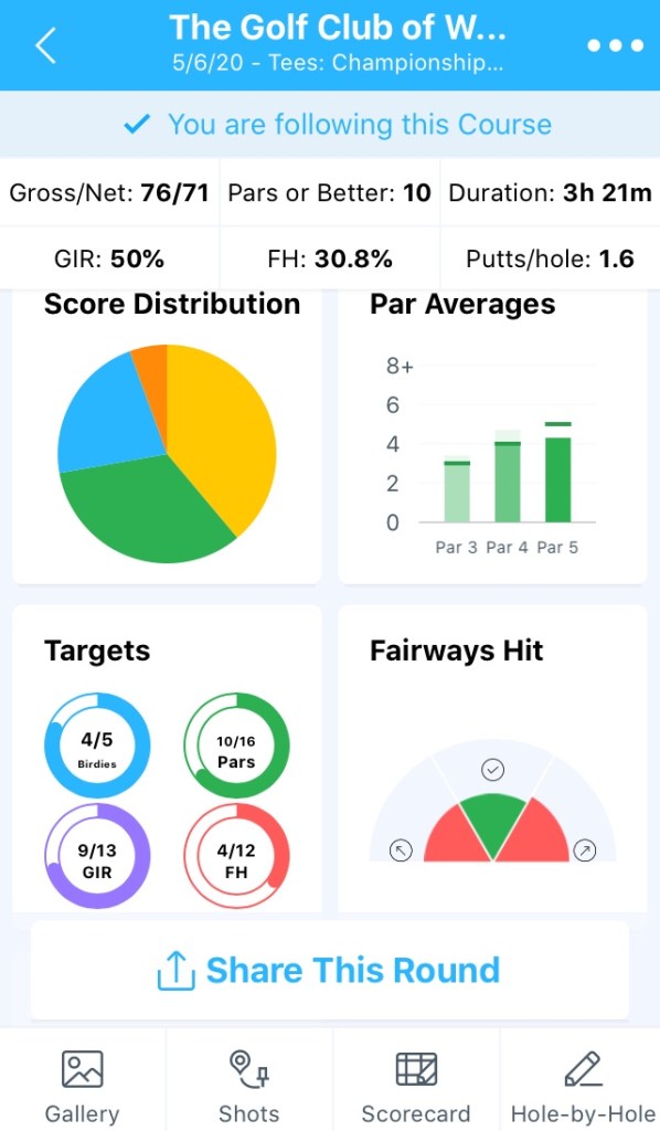 However, that didn’t matter because of my new weapons. On Tuesday after the golf shops reopened, I went to Golf Discount STL in O’Fallon and bought a “new” used Cobra F9 3-wood and 5-wood. They both have perfectly weighted (70g and 75g respectively) stiff aftermarket shafts. The 3-wood is the tour version with a smaller head and weight in the front to take down spin and promote a fade. I was a little worried about getting the tour version, but I convinced myself it was a good idea because it might be easier to hit out of tricky lies with the smaller head and is potentially longer. After a range session yesterday and playing with it today, it might be my new favorite club. From the deck, it went about 250 yards with rollout. I hit it off the tee on 17 and smoked it nearly 280 yards right down the middle — by far the farthest I have ever hit a 3-wood. It completely eliminates the left-hand miss which along with crazy distance control problems, my old 3-wood had trouble with. It not only brings long par 5’s into play in 2 if they don’t have a forced carry in front of the green, but it also gives me another weapon off the tee if I have another driving day like today.