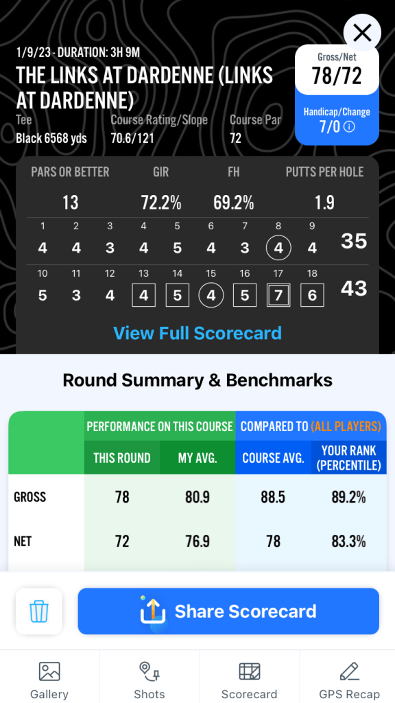 It was a pretty great round for the Fairways and Greens philosophy. The fairways number was only as low as it was because although I piped the first drive on the widest fairway in the county, it took me a few holes to get the timing with the new shaft and head down. I had literally never hit a ball before the first tee ball. That greens number is absurd for how small and elevated the greens are out there, plus it was blowing around 10 mph like it always seems to be there. It should have been higher, but I bladed an 8-iron into the creek on 17 and made a quad because I was trying to be too fine with an 8-iron cut instead of just hitting a 9 full and getting on the green, and then I left 40-yard pitch one small bounce from the green instead of getting it past the front pin and taking the birdie putt. I have to remember to refocus on the F&G plan throughout the round and not get caught up in trying to attack pins.